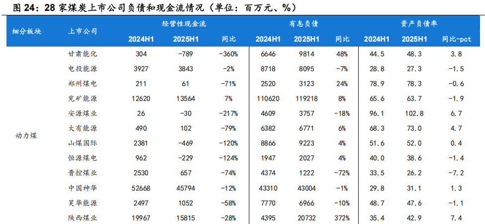 2025年上半年,经营性现金流同步呈现下降,资产负债率同比小幅上升。28家煤炭上市公司2025年上半年经营性现金流合计为1042.20亿元,同比-379.19亿元,同比-27%;有息负债合计为5523.58亿元,同比+15.15%。资产负债率平均为53.2%,同比+1.3pct;如果剔除掉中国神华,27家煤炭上市公司2025年上半年经营性现金流合计为584.26亿元,同比-310.45亿元,同比-34.70%;有息负债合计为5093.54亿元,同比+16.73%。资产负债率平均为54.0%,同比+1.3pct。