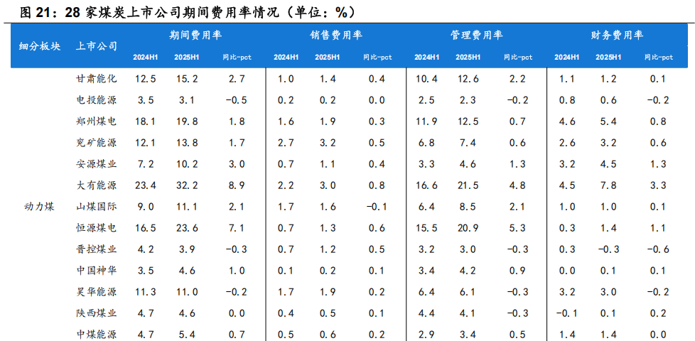2025年上半年期间费用方面,绝对值同比下降,费用率受营收下降影响有所提升。从绝对值来看,2025年上半年28家煤炭上市公司累计期间费用390.18亿元,同比-5.5%,其中,销售费用45.72亿元,同比-1.0%,管理费用263.24亿元,同比-7.6%,财务费用81.22亿元,同比-0.8%。从相对值来看(算数平均值方法),2025年上半年28家煤炭上市公司的期间费用率为12.09%,同比+1.57pct,其中,销售费用率为1.00%,同比+0.19pct,管理费用率为8.43%,同比+0.84pct,财务费用率为2.66%,同比+0.54pct。综合来看,在煤价同比下降背景下,多数煤企通过优化债务结构、成本控制等方式,降低成本费用,但受营收下降影响,费用比率有所提升。