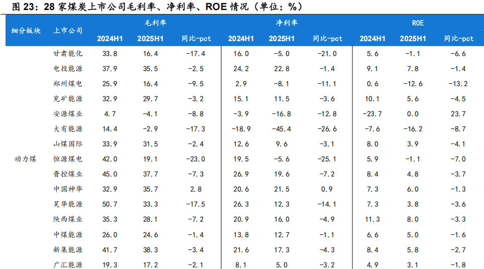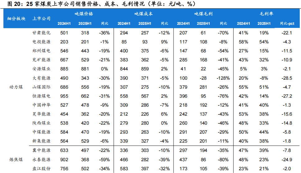 2025年上半年煤企成本降幅小于煤价降幅,业绩因此受到拖累。2025年上半年煤炭供需呈现宽松,其中火电发电受暖冬以及可再生能源发电高增挤压影响,供给端国内生产稳中有增,在煤炭供需宽松格局之下,2025年上半年煤价中枢下滑,2025年上半年秦港动力煤(Q5500,山西产)均价为675.67元/吨,同比-22.77%;2025年上半年京唐港主焦煤(山西产)均价为1,377.67元/吨,同比-38.79%。受市场煤价下行影响,2025年上半年25家煤炭上市公司(剔除广汇能源、山西焦煤、晋控煤业)煤炭的平均销售价格为480元/吨,同比-20%,降幅低于市场煤降幅(动力煤市场煤同比-22.77%);平均销售成本306元/吨,同比-9%;平均毛利173元/吨,同比-33%;毛利率36%,同比-7.4pct,售价下降拖累煤企盈利。