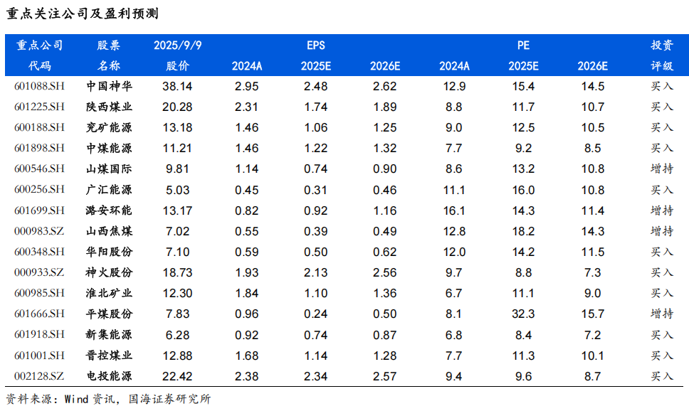 整体看,2025年上半年煤企成本虽同比下降,但难补煤价下跌,煤企业绩进一步回落。展望后续,反内卷影响之下,煤炭价格已然开启显著修复,且在查超产政策的影响下,煤价存在支撑,同时公司成本端仍在持续优化,故此煤企业绩低点或已显现。另一方面,市场对现阶段煤价的悲观认识亦已被充分定价,2025Q2主动型基金重仓股中持有煤炭板块比例已降至0.36%,持仓比例处于2008年以来较低水平,板块拥挤度已大幅下降。所以在煤价回暖、板块低拥挤度背景下,高股息率、现金奶牛的煤炭板块底部配置价值正逐步凸显。上半年,国家能源集团、山东能源集团、中国中煤能源集团等多家煤炭央国企对旗下上市公司启动增持或资产注入计划,亦释放利好,彰显煤企发展信心、增厚企业成长性与稳定性。从大方向来看,煤炭开采行业供应端约束逻辑未变,需求端可能阶段性起伏波动,价格亦呈现一定震荡和动态再平衡,头部煤炭企业资产质量高,账上现金流充沛,呈现“高盈利、高现金流、高壁垒、高分红、高安全边际”五高特征。建议把握低位煤炭板块的价值属性,维持煤炭开采行业“推荐”评级。重点关注:(1)稳健型标的:中国神华、陕西煤业、中煤能源、电投能源、新集能源。(2)动力煤弹性较大标的:兖矿能源、晋控煤业、广汇能源。(3)焦煤弹性较大标的:淮北矿业、平煤股份、潞安环能、山西焦煤。
