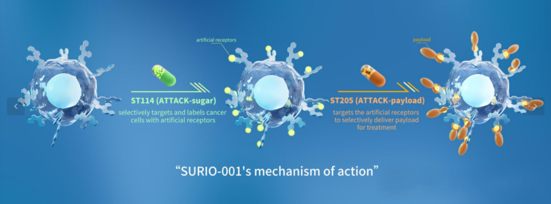 SURIO-001是瑞奥生物全球首创的ATTACK技术(Active Tissue Targeting via Anchored ClicK Chemistry)平台研发的首款抗肿瘤靶向药物,为肿瘤特异性标记药物ST114与细胞毒素偶联物ST205联用的组合疗法。SURIO-001在胃癌、胆管癌、膀胱癌、肾癌、头颈癌、宫颈癌、卵巢癌、乳腺癌、前列腺癌、胰腺癌、肝癌、结直肠癌等的治疗中具有广泛应用潜力。