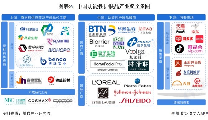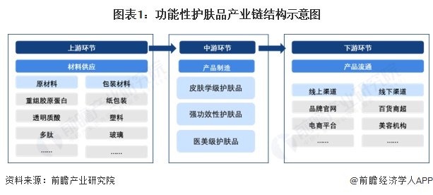 功能性护肤品产业链的上游是材料供应环节,包括原材料供应和包装材料供应,其中代表性原材料包括重组胶原蛋白、透明质酸、多肽等,代表性包装材料包括纸包装、塑料、玻璃等。产业链中游是功能性护肤品的制造环节,根据成分和功能的不同,分为皮肤学级护肤品和强功效性护肤品。产业链下游是产品的流通环节,分为线上和线下渠道。