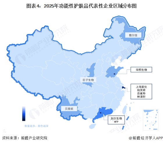 从代表性企业分布情况来看,上海的功能性护肤品企业最多,包括上海家化、珀芙研、百雀羚、林清轩,广东分布有创尔生物和HFP,云南有贝泰妮,陕西有巨子生物,黑龙江有敷尔佳。