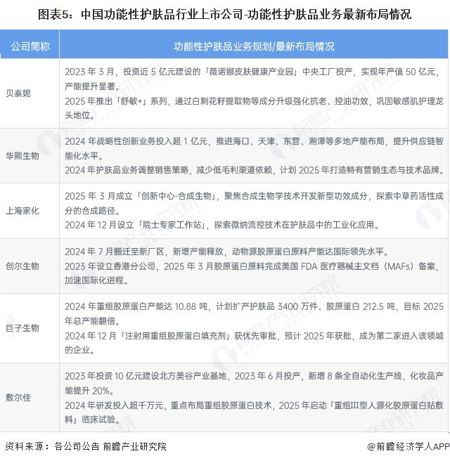 2021年5月1日,我国首部专门针对化妆品注册备案管理的部门规章《化妆品注册备案管理办法》开始施行后,配套政策相继出台,功能性护肤品作为优质国货赛道,迎来重大利好。据此,功能性护肤品行业的上市企业也相应提出了最新的发展规划,如贝泰妮将持续聚焦以“薇诺娜(Winona)”为核心的敏感肌产品开发,投资近5亿元建设的「薇诺娜皮肤健康产业园」中央工厂投产;华熙生物战略性创新业务投入超1亿元,推进海口、天津、东营、湘潭等多地产能布局,提升供应链智能化水平。此外,其他上市公司也明确了其功能性护肤品业务的发展布局: