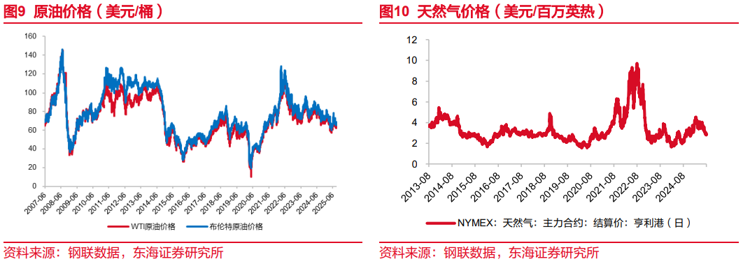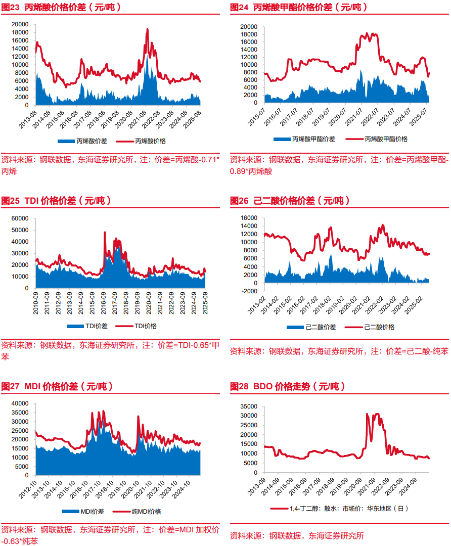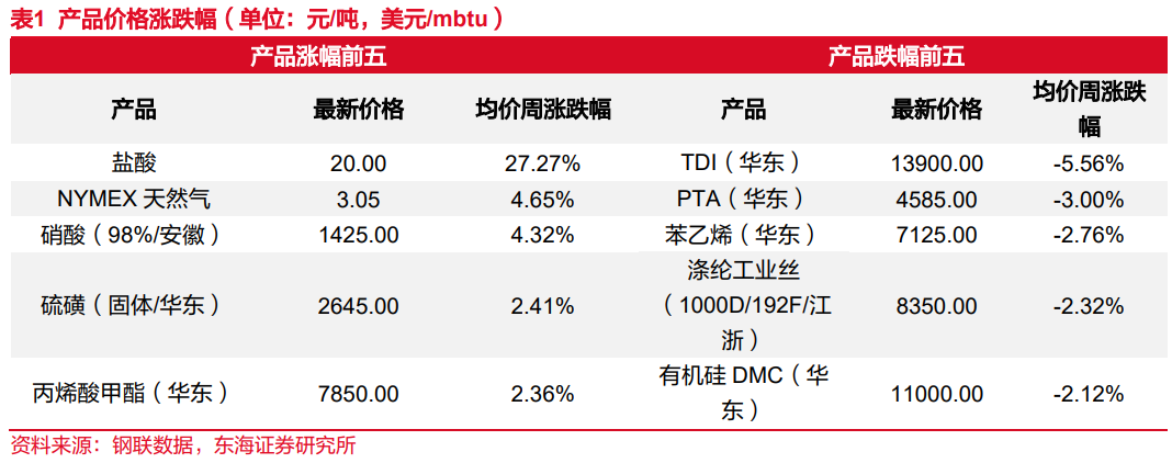 价格数据跟踪:上周(2025/9/1~2025/9/5)价格涨幅靠前的品种:分别为盐酸:27.27%;NYMEX天然气:4.65%;硝酸(98%/安徽):4.32%;硫磺(固体/华东):2.41%;丙烯酸甲酯(华东):2.36%。价格跌幅靠前的品种:分别为TDI(华东):-5.56%;PTA(华东):-3.00%;苯乙烯(华东):-2.76%;涤纶工业丝(1000D/192F/江浙):-2.32%;有机硅DMC(华东):-2.12%。