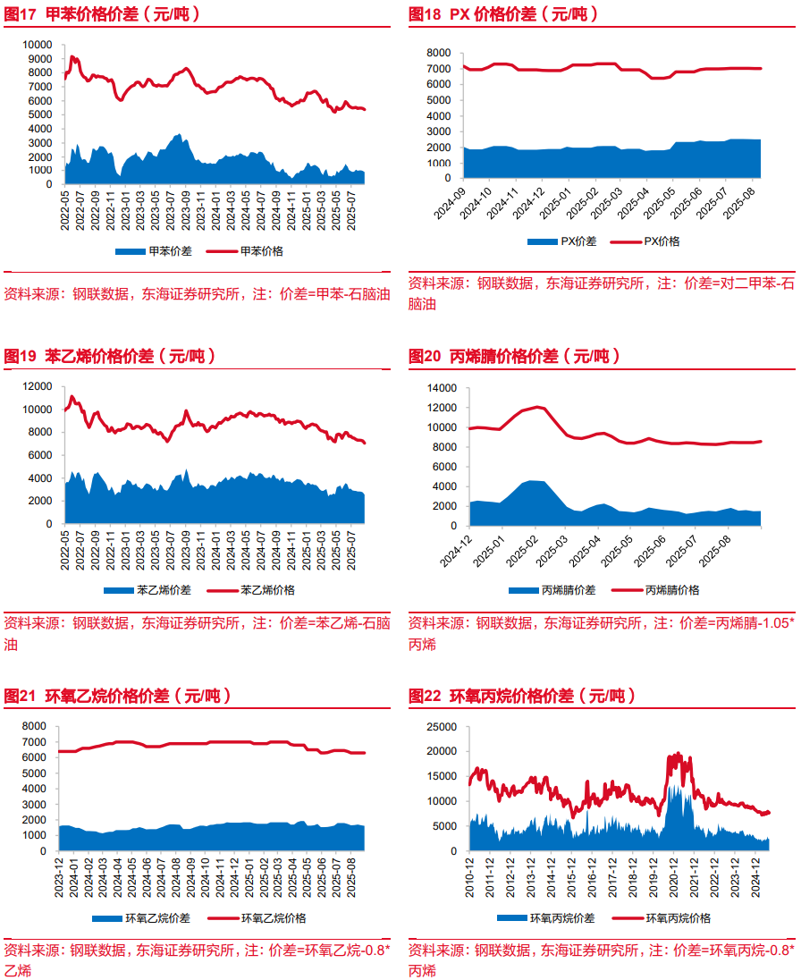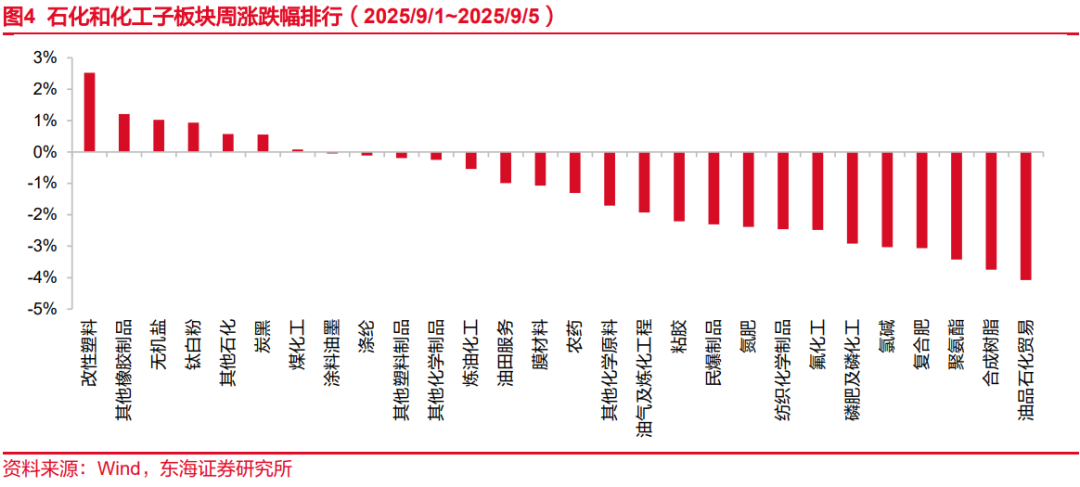 行业基础数据跟踪:上周(2025/9/1~2025/9/5),沪深300指数下跌0.81%,申万石油石化指数下跌1.10%,跑输大盘0.29pct,申万基础化工指数下跌1.36%,跑输大盘0.55pct,涨幅在全部申万一级行业中分别位列第17位、第20位。子板块涨跌幅,涨幅前五的为:改性塑料:2.52%;其他橡胶制品:1.21%;无机盐:1.03%;钛白粉:0.93%;其他石化:0.57%。跌幅前五的为:油品石化贸易:-4.08%;合成树脂:-3.74%;聚氨酯:-3.43%;复合肥:-3.06%;氯碱:-3.03%。