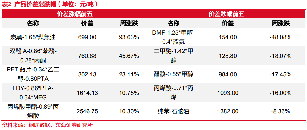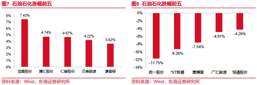 子板块涨跌幅,涨幅前五的为:改性塑料:2.52%;其他橡胶制品:1.21%;无机盐:1.03%;钛白粉:0.93%;其他石化:0.57%。跌幅前五的为:油品石化贸易:-4.08%;合成树脂:-3.74%;聚氨酯:-3.43%;复合肥:-3.06%;氯碱:-3.03%。