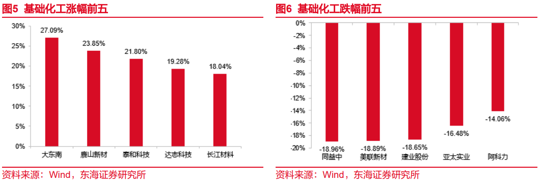 上周(2025/9/1~2025/9/5),基础化工板块涨幅居前的个股有:大东南:27.09%;鹿山新材:23.85%;泰和科技:21.80%;达志科技:19.28%;长江材料:18.04%。