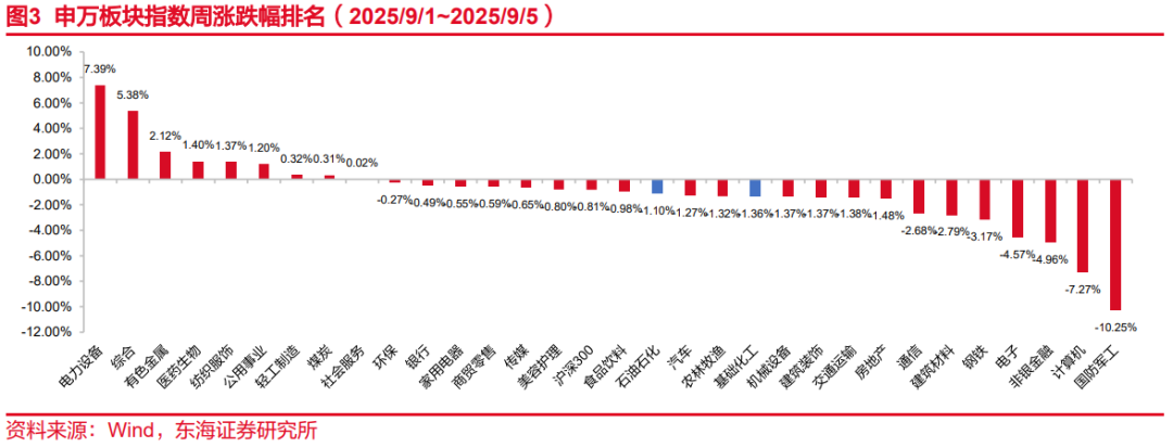 上周(2025/9/1~2025/9/5),沪深300指数下跌0.81%,申万石油石化指数下跌1.10%,跑输大盘0.29pct,申万基础化工指数下跌1.36%,跑输大盘0.55pct,涨幅在全部申万一级行业中分别位列第17位、第20位。