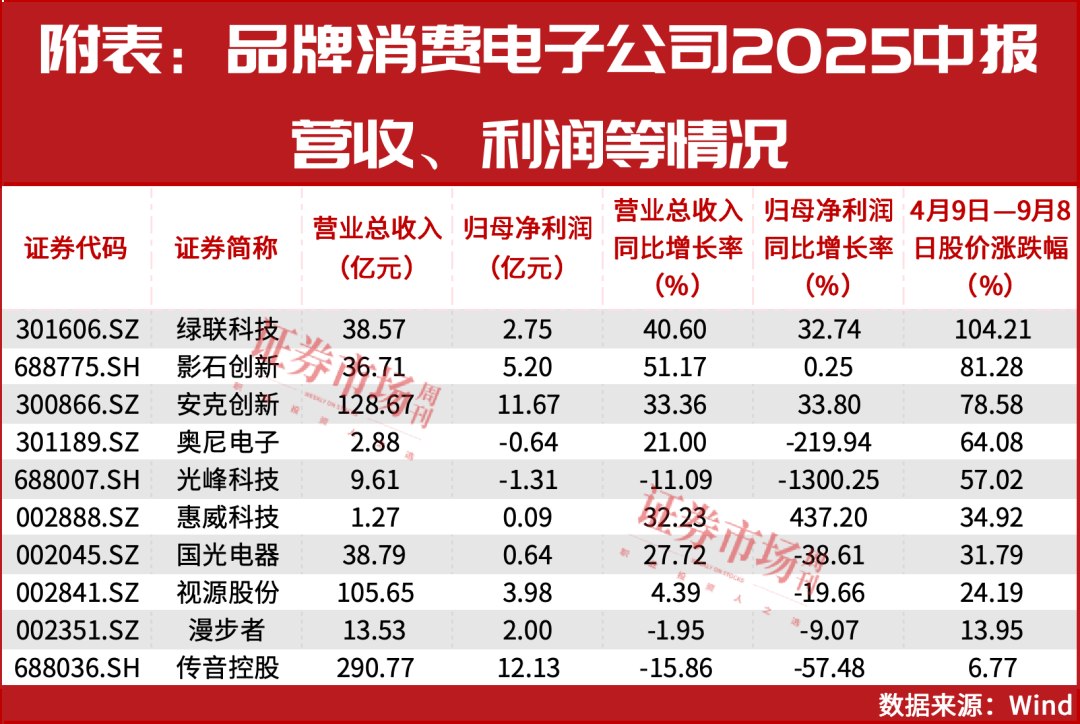 另外,在需求端,根据TrendForce集邦咨询最新调研数据,2025年8月,电视、显示器及笔电面板价格整体持平。种种信息显示,品牌消费电子行业基本面稳步向好。也因此,有机构推荐关注传音控股、漫步者、安克创新等公司。