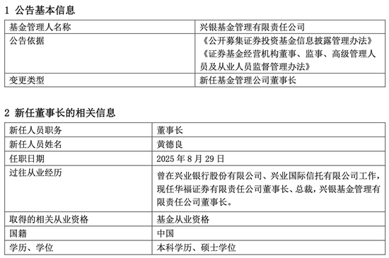 2025年8月30日,兴银基金董事长职位在空缺五个月后迎来新任者,华福证券董事长兼总裁黄德良正式接任,市场普遍将此视为控股股东稳定公司治理的关键举措。