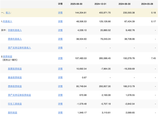 从利息收入来看,2025年上半年为48506.53万元,较2024年上半年67424.39万元下滑28.06%,其中存款利息收入从9482.76万元降至4039.10万元,跌幅超57%,债券利息收入从38728.96万元微降至38504.60万元。