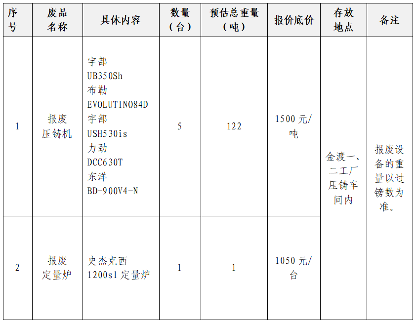 现我司有一批报废压铸机及定量炉需外卖处置,我司秉持“公平”、“公开”、“公正”原则,现就“报废压铸机及定量炉处置项目”进行公众号公开询价,邀请有资质回收商参与询价,具体事项公告如下: