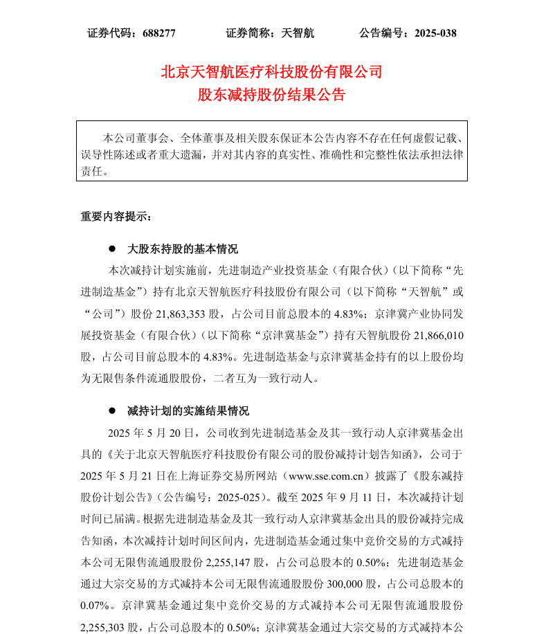 天智航 9 月 12 日公告显示,先进制造基金及其一致行动人京津冀基金在 6 月 12 日至 9 月 11 日期间合计减持 1.12% 股份,远低于原计划的 3% 减持上限。此次减持均价区间为 13.01-18.22 元,合计套现 7344.5 万元,其中大宗交易占比约 11%,对二级市场冲击相对有限。