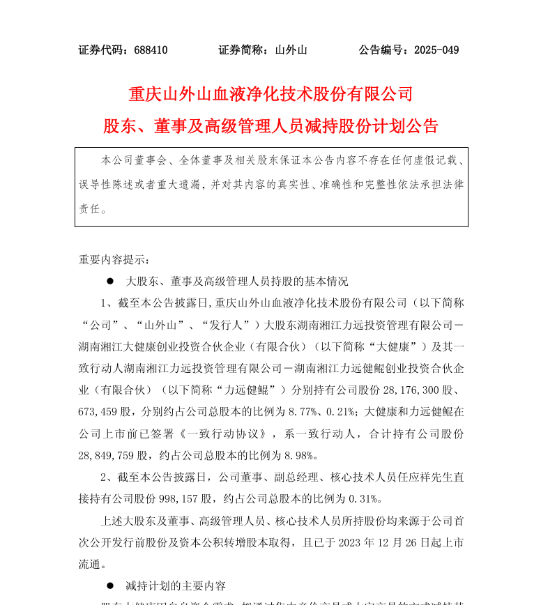 山外山 9 月 11 日公告显示,大股东湖南湘江大健康创业投资合伙企业(简称 "大健康")拟减持不超过 4% 股份,董事任应祥拟减持 0.08%,合计拟减持比例达 4.08%。这已是大健康及其一致行动人半年内的第三次减持,此前在 7-8 月间已累计减持超过 4% 股份,形成 "密集减持" 态势。