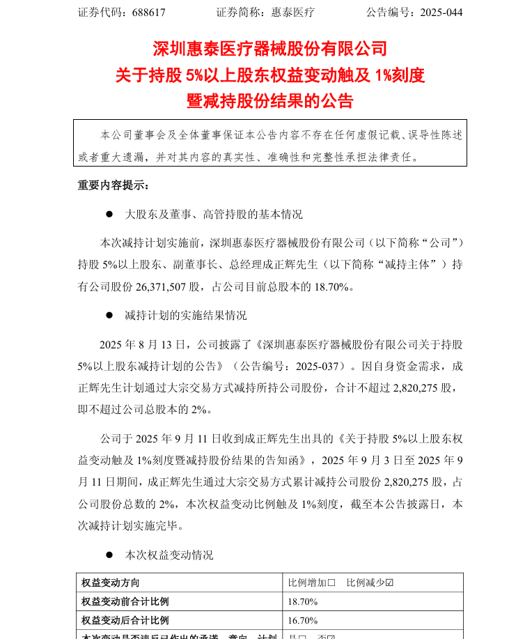成正辉的减持选择在大宗交易市场完成,接手方大概率为长期机构投资者,反映出市场对公司估值的认可。在进口替代加速的背景下,惠泰医疗的创新产品布局获得资本青睐,这也解释了为何大额减持未对公司估值造成冲击,公司明确表示 "不会对治理结构及持续经营产生重大影响"。