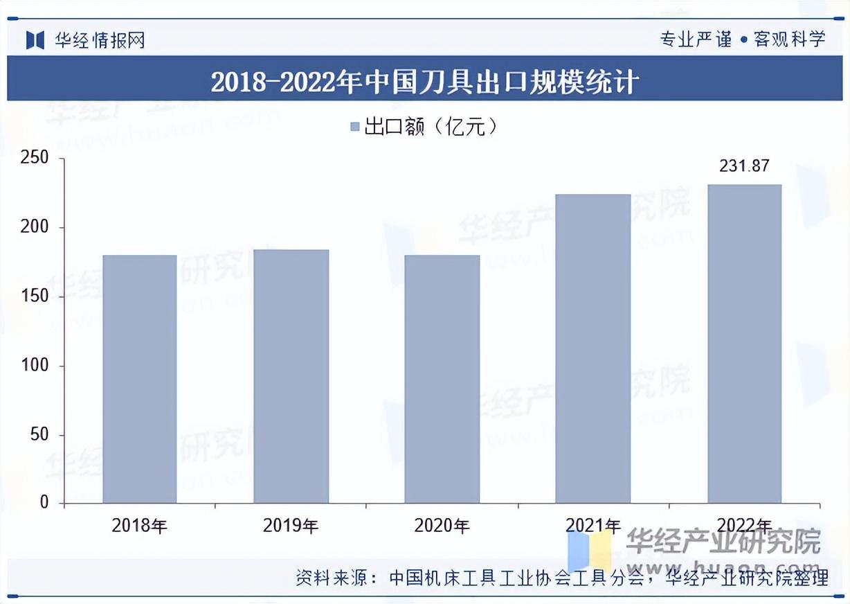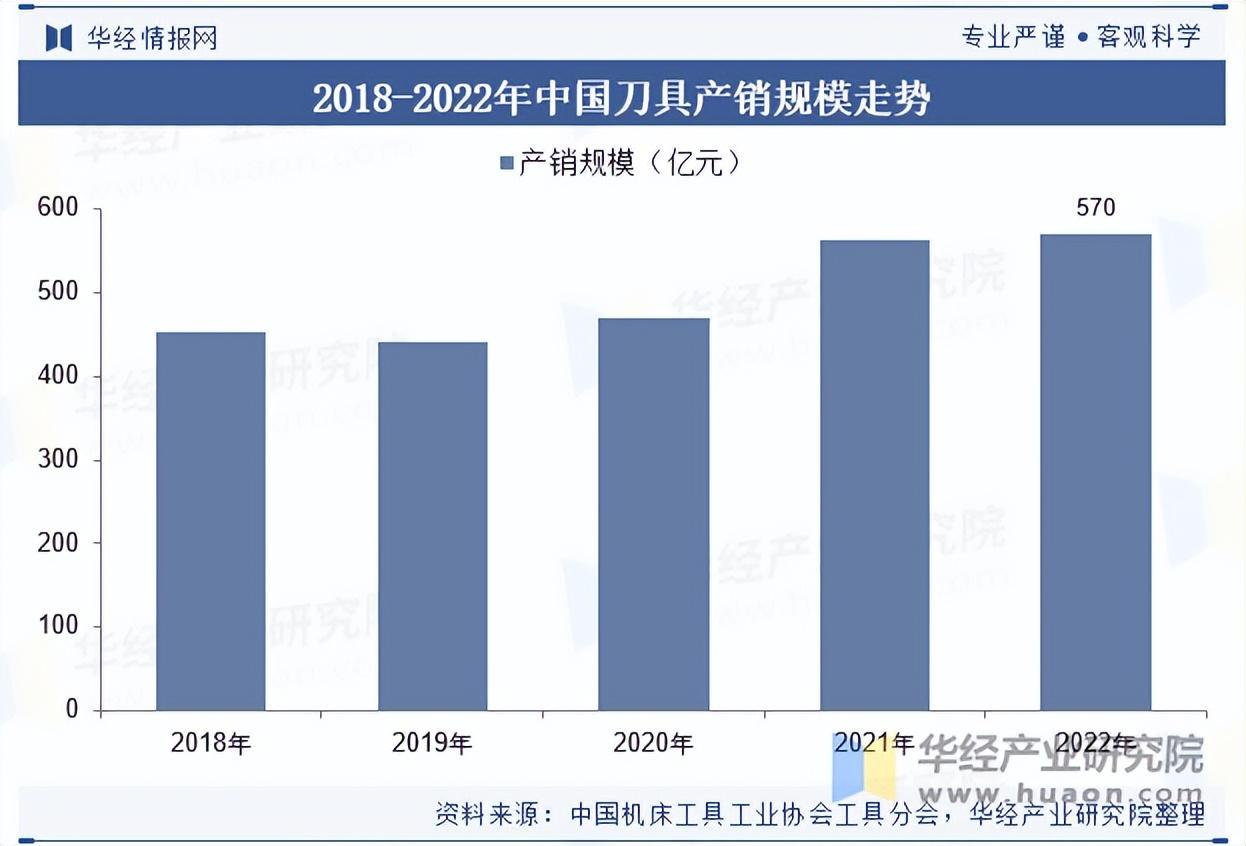 由于国内中小刀具企业,缺乏技术积累和研发能力,资本实力较弱,主要生产低端传统刀具。考虑出口,2022年国产刀具产销总规模(内销加出口)570亿元,增长1%。
