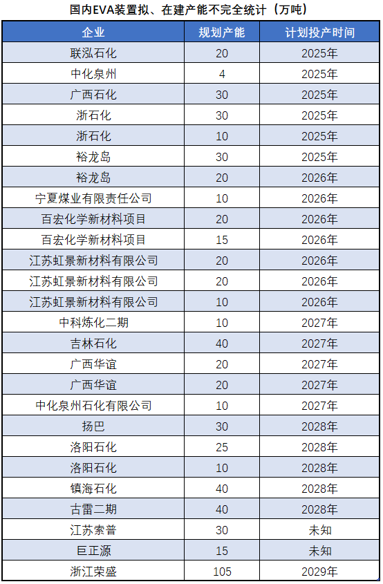 9月2日,中国化学工程第六建设有限公司山东分公司承建的联泓格润(山东)新材料有限公司20万吨/年EVA项目35KV变配电室一次受电成功。2025年国内有多套EVA新装置计划投产,预计新增产能80万~100万吨。