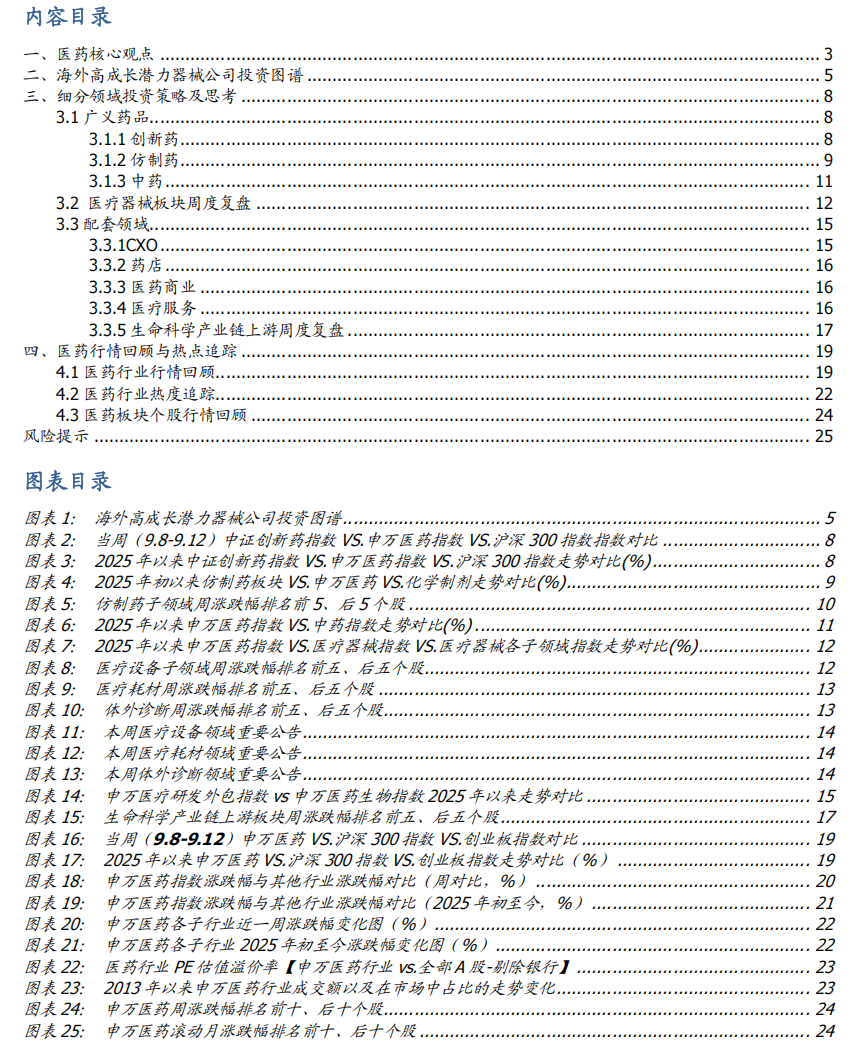 当周(9.8-9.12)申万医药指数环比-0.36%,跑输沪深300指数,跑输创业板指数。本周周专题,我们梳理了海外高成长潜力器械公司投资图谱,供投资者参考。