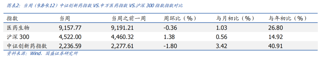 当周(9.8-9.12)中证创新药指数周环比-1.80%,跑输医药指数,跑输沪深300指数。截至9月12日,中证创新药指数2,236.59点。申万医药指数周环比-0.36%,沪深300指数周环比1.38%。