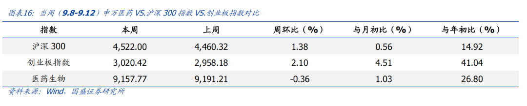 当周(9.8-9.12)申万医药指数环比-0.36%,跑输沪深300指数,跑输创业板指数。当周申万医药指数周环比-0.36%,沪深300指数周环比+1.38%,创业板指数周环比+2.10%,医药跑输沪深300指数1.75个百分点,跑输创业板指数2.47个百分点。2025年初至今申万医药上涨26.80%,沪深300上涨14.92%,创业板指数上涨41.04%,医药跑赢沪深300指数,跑输创业板指数。