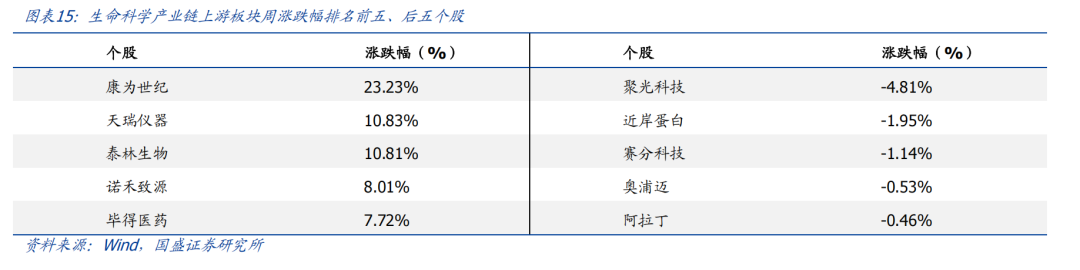 当周(9.8-9.12)申万医药指数下跌0.36%,生命科学上游涨幅算数平均值为2.72%,涨幅中位数为0.60%。