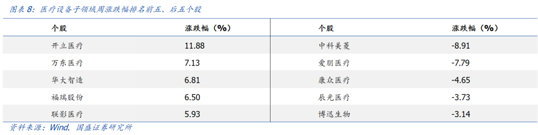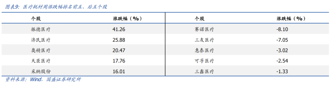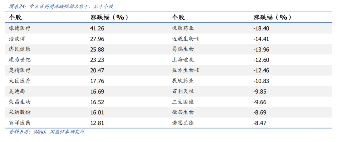 当周涨跌幅排名前5为振德医疗、浩欧博、济民健康、康为世纪、奥精医疗。后5为悦康药业、迈威生物-U、易瑞生物、上海谊众、益方生物-U。