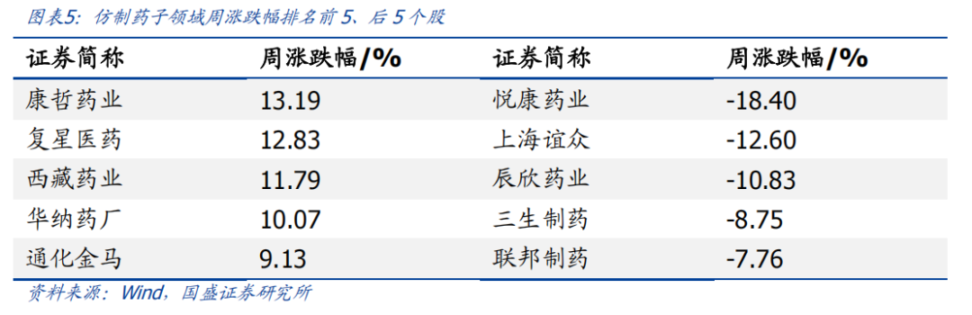 当周(9.8-9.12)涨跌幅排名前5为康哲药业、复星医药、西藏药业、华纳药厂、通化金马。后5为悦康药业、上海谊众、辰欣药业、三生制药、联邦制药。