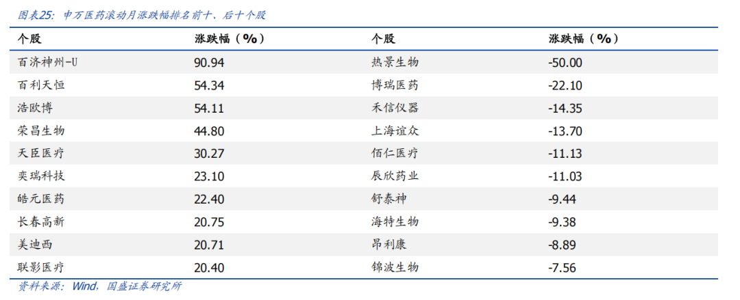 滚动月涨跌幅排名前5为百济神州-U、百利天恒、浩欧博、荣昌生物、天臣医疗。后5为热景生物、博瑞医药、禾信仪器、上海谊众、佰仁医疗。