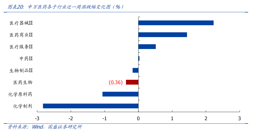 子行业方面,当周表现最好的为医疗器械II,环比+2.23%;表现最差的为化学制剂,环比-2.83%。