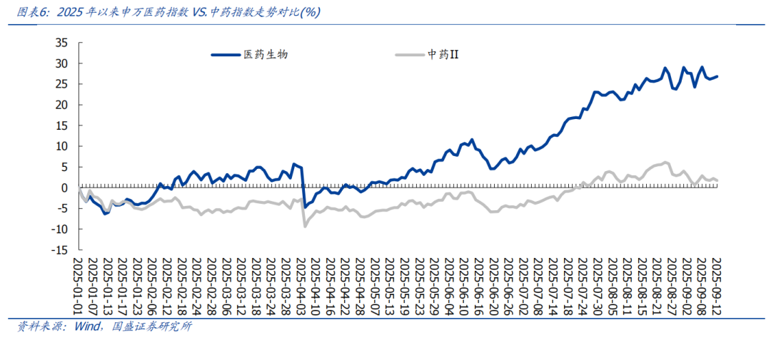 当周(9.8-9.12)申万医药指数下跌0.36%,中药指数上涨0.03%,跑赢医药指数0.39个百分点;2025年初至今申万医药指数上涨26.80%,中药指数上涨1.73%,跑输医药指数25.07个百分点。