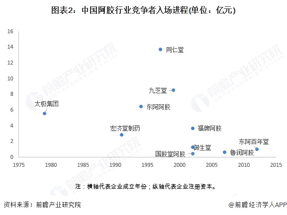 从代表性企业入场进程来看,太极集团入场较早,于1979年成立;大多数企业成立于2000-2005年间,福牌阿胶、御生堂、国胶堂等企业均成立于这一时期。从注册资本情况来看,同仁堂企业的注册资本较高,其注册资本超过12亿元,主要由于其是综合型中药品牌,覆盖多种中药次产品,九芝堂、东阿阿胶、太极集团的注册资本相对较高,在5-10亿元区间内。其余竞争者注册资本不超过5亿元。