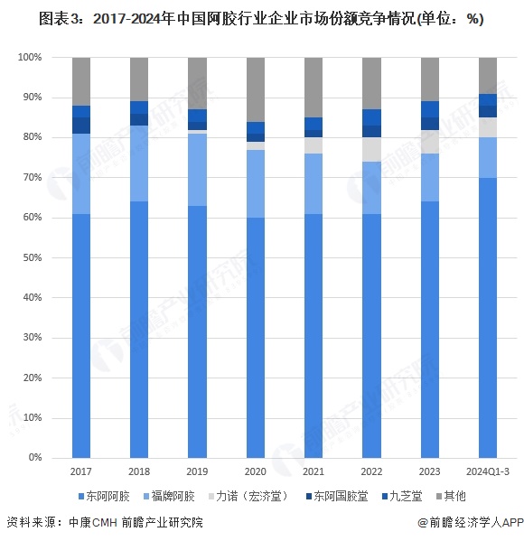 目前,中国主要的阿胶生产企业有东阿阿胶股份有限公司、山东福牌阿胶股份有限公司、山东宏济堂制药集团股份有限公司、山东鲁润阿胶药业有限公司、中国北京同仁堂(集团)有限责任公司、九芝堂股份有限公司、重庆太极实业(集团)股份有限公司、兰州佛慈制药股份有限公司等。其中东阿阿胶股份有限公司和山东福牌阿胶股份有限公司长期以来分别作为我国阿胶产品高端市场和中低端市场的代表企业,占据了我国大部分阿胶市场份额,前瞻结合中康CMH披露的阿胶产品销售额对阿胶行业企业竞争情况进行综合分析,2024年前三季度,东阿阿胶股份有限公司占我国阿胶行业市场份额的比重达70%,福牌阿胶占我国阿胶行业市场份额的比重为10%。我国的阿胶行业呈现双寡头竞争的格局。