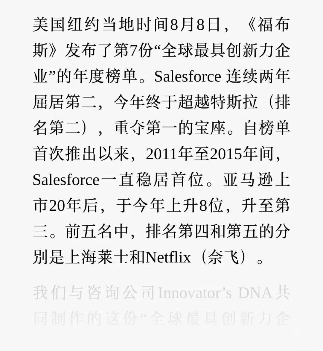 2017年,《福布斯》发布了第7份“全球最具创新力企业”的年度榜单,排名前五的依次是:Salesforce、特斯拉、亚马逊、上海莱士、Netflix(奈飞)。
