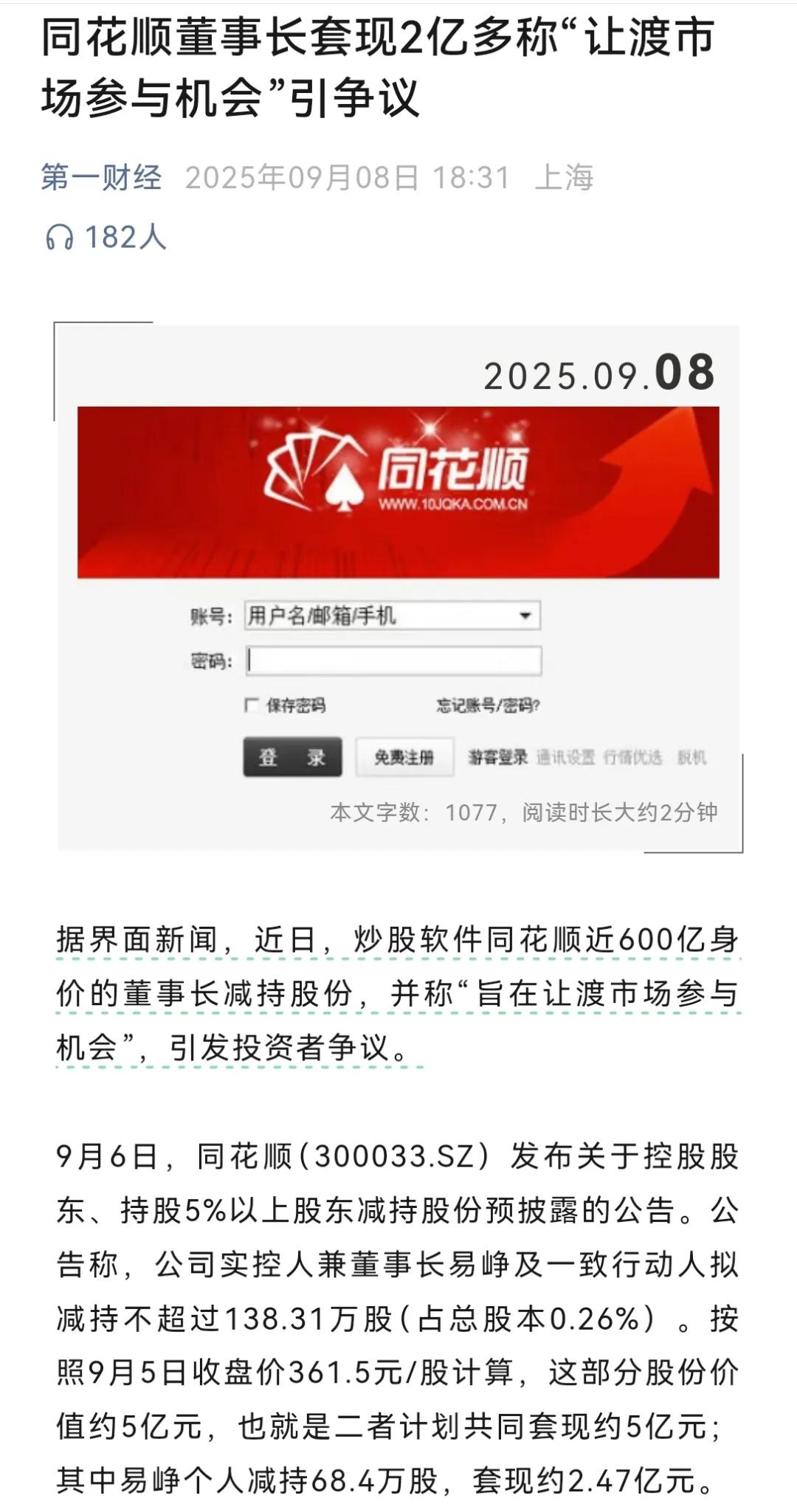 比如同花顺(SZ300033)的易老板看大A行情这么牛,怕筹码不够大伙儿抢,就有了一个伟大的计划:减持,让渡市场参与机会。