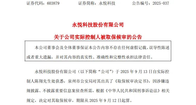9月14日,永悦科技(603879.SH)公告称,公司于2025年9月13日自实际控制人陈翔处获悉,泉州市公安局对其出具了《取保候审决定书》,因涉嫌违规披露、不披露重要信息案侦查所需,根据相关规定,决定对其取保候审,期限从2025年9月12日起算。目前,陈翔未在公司担任董事、监事、高级管理人员或其他任何职务,公司日常生产经营正常,各项工作有序开展。