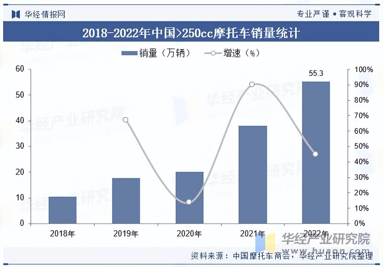 从排量结构上看,我国两轮摩托车主要以50-250ml为主流排量段,合计占比达90%以上,而50ml以下的小排量产品市场则逐渐萎缩至5%左右。其中>250cc中大排量摩托车2022年销量55.3万辆,同比增长44.7%,18-22年销量CAGR高达51.2%,但占整体销量比例仅2.6%。未来,随着我国摩托车休闲文化产业步入快速发展期,国内用户对于外观设计新颖、性能更强、中大排量休闲娱乐车型的需求将进一步增长,其市场仍有较大的发展空间。