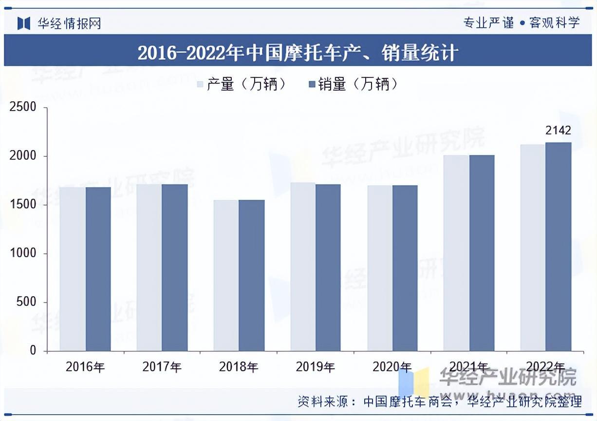 2022年我国摩托车产销量均突破2100万辆,年产量自2016年的1682.1万辆上涨至2022年的2129.22万辆,停止了2014年以来产量持续缩减的颓势;我国摩托车年销量自2016年的1680万辆增长至2022年的2142万辆,年均复合增长率达到3.53%。
