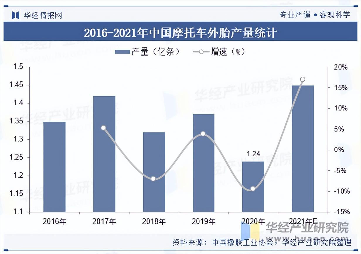 2020年整体疫情导致出行需求下降,我国摩托车轮胎产量仅为1.24亿条,较2019年的1.37亿条下降了0.13亿条,下降幅度为9.49%,据预计2021年我国摩托车外胎产量将超1.45亿条。随着轮胎市场的回暖,我国摩托车行业的发展将得到有力的支撑。