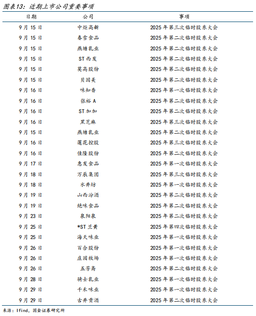 从个股表现来看,周度涨跌幅居前的为:ST西发(维权)(+11.07%)、煌上煌(+10.87%)、金字火腿(+10.71%)、酒鬼酒(+5.57%)、西麦食品(+4.94%)等。涨跌幅靠后的为:万辰集团(-11.31%)、会稽山(-7.20%)、紫燕食品(-6.43%)、*ST岩石(-4.68%)、妙可蓝多(-4.40%)等。