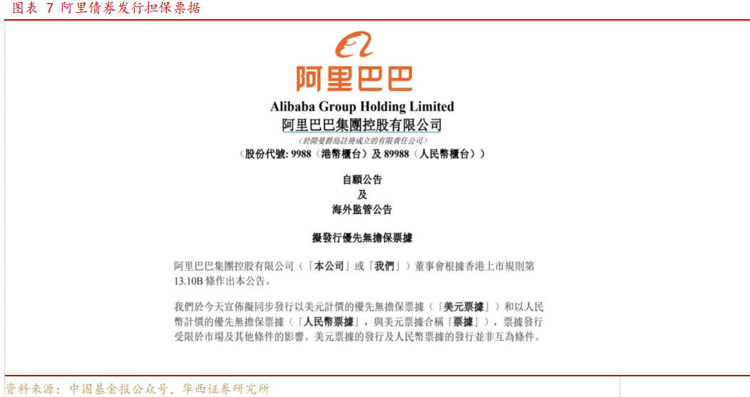 根据中国基金报,11月18日早间,阿里巴巴在港交所公告称,拟同步发行以美元计价的优先无担保票据和以人民币计价的优先无担保票据。公告显示,阿里巴巴拟将票据发行所得募集资金净额用于一般公司用途,包括偿还境外债务和股份回购。据消息人士透露,阿里巴巴集团计划通过双币债券发行筹集约50亿美元。
