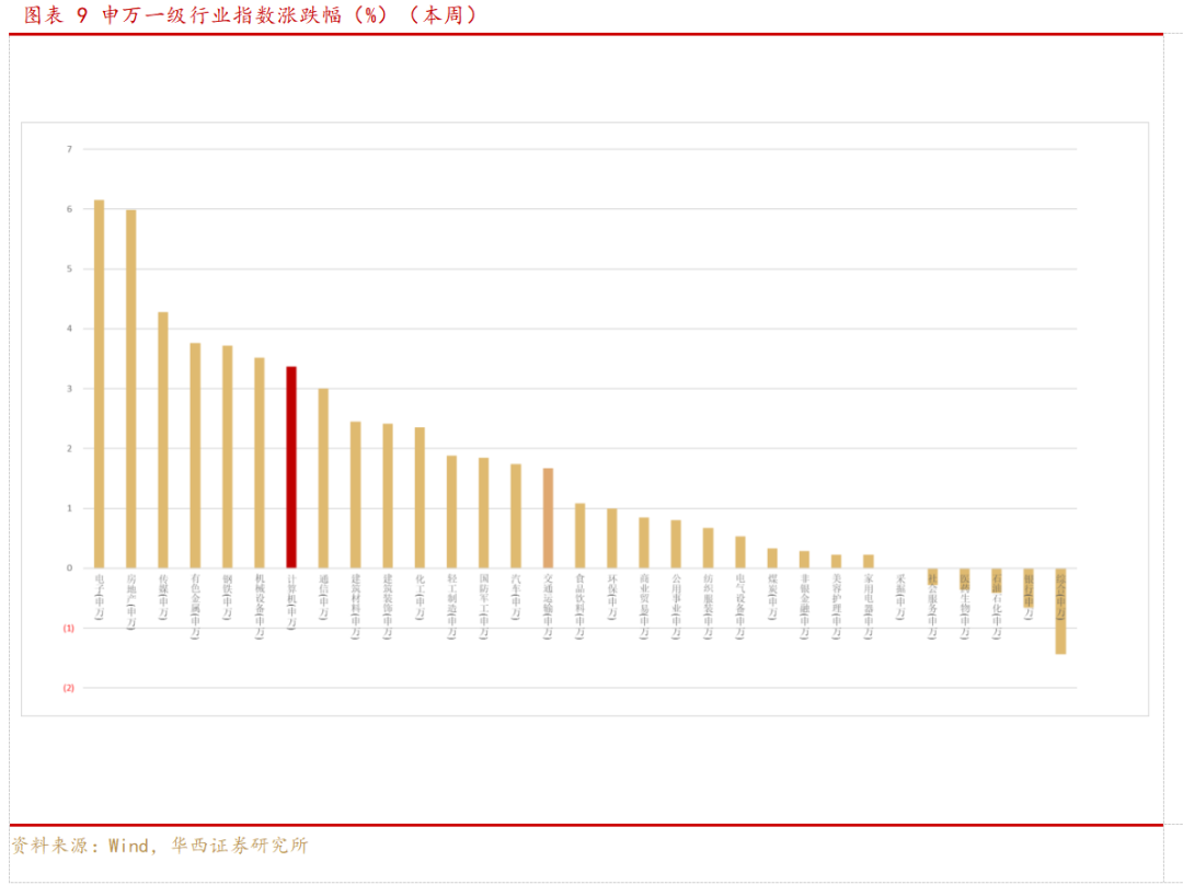 本周市场计算机位列第7位。本周沪深300指数上升1.38%,申万计算机行业周涨幅3.37%,高于指数1.99个pct,在申万一级行业中排名第7位。