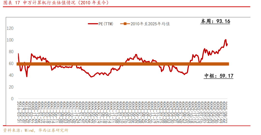 从估值情况来看,SW计算机行业PE(TTM)从2018年低点37.60倍升至93.16倍,2010-2025年历史均值59.17倍,行业估值高于历史中枢水平。