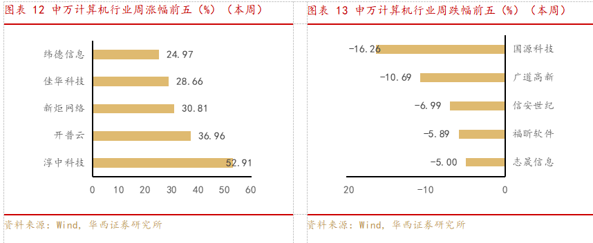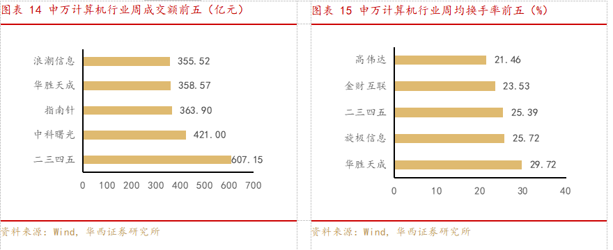 从周成交额的角度来看,二三四五、中科曙光、指南针、华胜天成、浪潮信息位列前五。从周换手率的角度来看,华胜天成、旋极信息、二三四五、金财互联、高伟达位列前五。