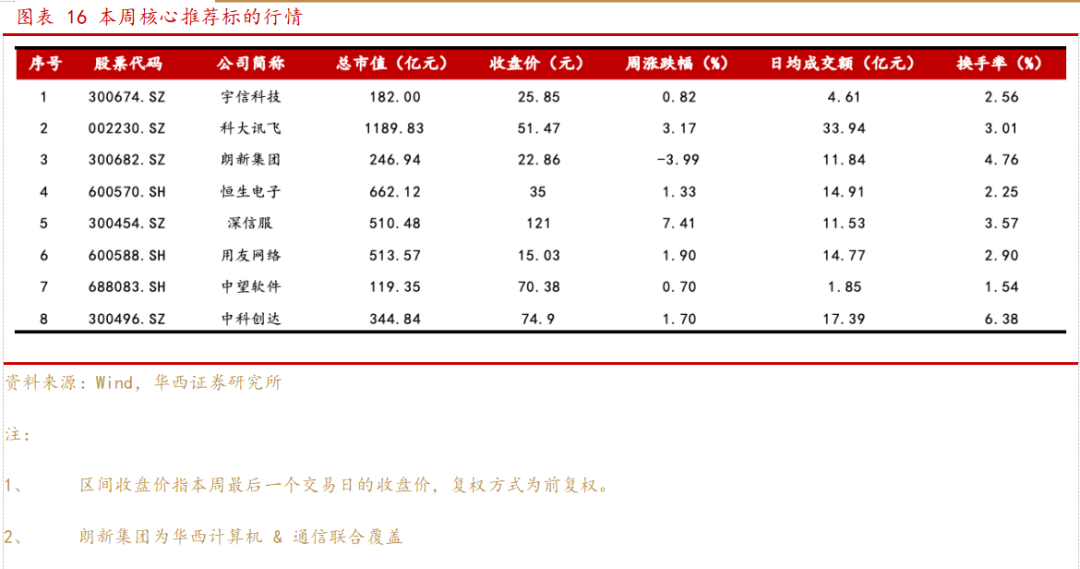 本周板块整体呈现普遍上升的情况下,我们的8只核心推荐标的中,有7只上升,1只下跌。其中涨幅最大的为深信服,涨幅为7.41%。下跌的股票为朗新集团,跌幅为3.99%。