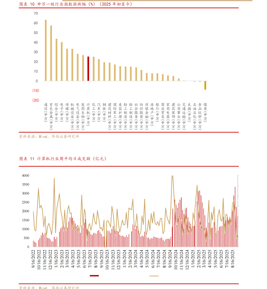 2025年初至今申万计算机行业涨幅在申万一级31个行业中排名第9名。年初至今申万计算机行业累计上涨25.17%,在申万一级31个行业中排名第9位,沪深300上升14.92%,高于指数10.25个百分点。