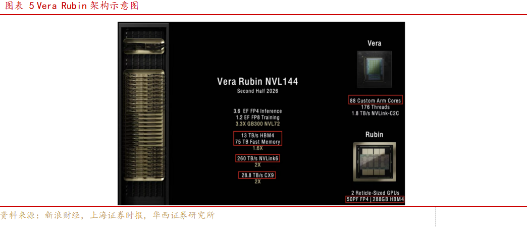 NVIDIA 之前发布的Vera Rubin NVL144 系统(PS:不包含 Rubin CPX GPU),Vera CPU 包含 88 个 Arm Core:Rubin GPU 包含 288GB HBM4 显存,带宽为 13TB/s,50 PF FP4 算力,2 个 Die。Rubin GPU 的 FP4 算力是 FP8 的 3x,与 B300 一致。Vera Fast Memory 为 (75TB - 288GB*72) / 36 = 1.5TB。NVLink6 带宽为 260/72 = 3.6 TB/s。ConnectX-9 网卡带宽为 28.8TB/s / 144 = 200 GB/s = 1600 Gbps。HBM4 总带宽为 13*72=936TB/s。