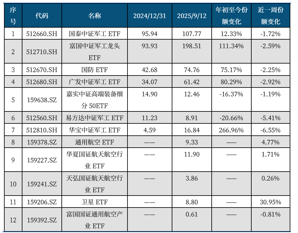 图24 近期军工类ETF基金(含通航、航空航天、卫星等大军工赛道)份额变化(单位:亿份)