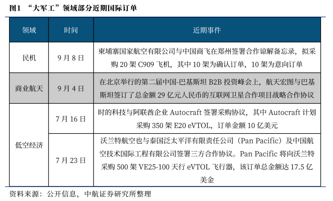“大军工”相关领域的发展使得国际市场越来越受重视,“大军工”出海一方面是技术迭代与产业成熟,产品竞争力提升的必然趋势,另一方面也是国际新形势新变化催化的结果。近期,无论是民机、商业航天、低空经济、军贸等均取得较多进展,我们预计,“大军工”在未来一段时间有望迎来内需外贸共振的较好局面。