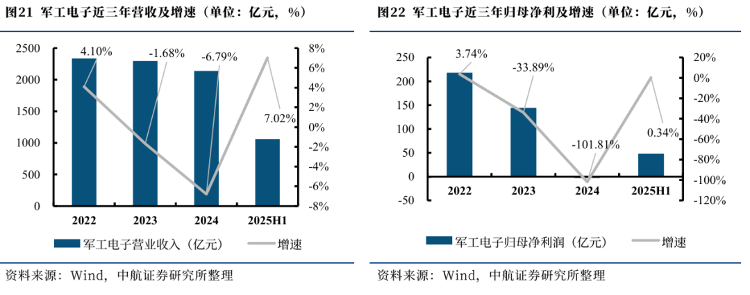 2025年上半年军工上市公司军工电子板块合计实现营业收入(1058.43亿元,+7.02%),归母净利润(47.82亿元,+0.34%)。军工电子企业较多为军民两用企业,营收利润中除了军工行业外,同时面向半导体、新能源汽车等,具备较好的抗风险能力;同时在军事智能化浪潮中,军工电子需求将有望进一步增加。